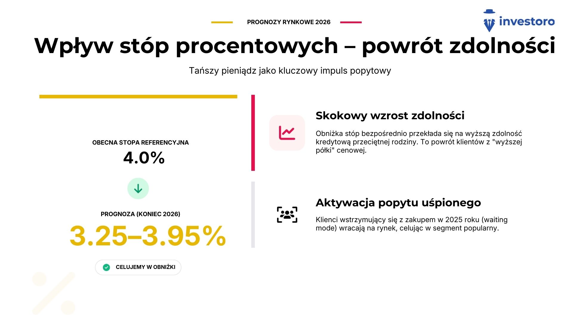 Po okresie zaciskania pasa, rok 2026 przyniesie odbudowę siły nabywczej. Kluczowym impulsem będą prognozowane obniżki stóp procentowych. Rynek spodziewa się zejścia stopy referencyjnej poniżej obecnych 4% (celując w przedział 3,25–3,95% na koniec roku). Tańszy pieniądz oznacza skokowy wzrost zdolności kredytowej i aktywację popytu „uśpionego” w 2025 roku. Klienci, którzy wcześniej balansowali na granicy zdolności, wrócą na rynek z większym budżetem, celując w segment popularny, który jest naturalnym środowiskiem dla większości flipów.