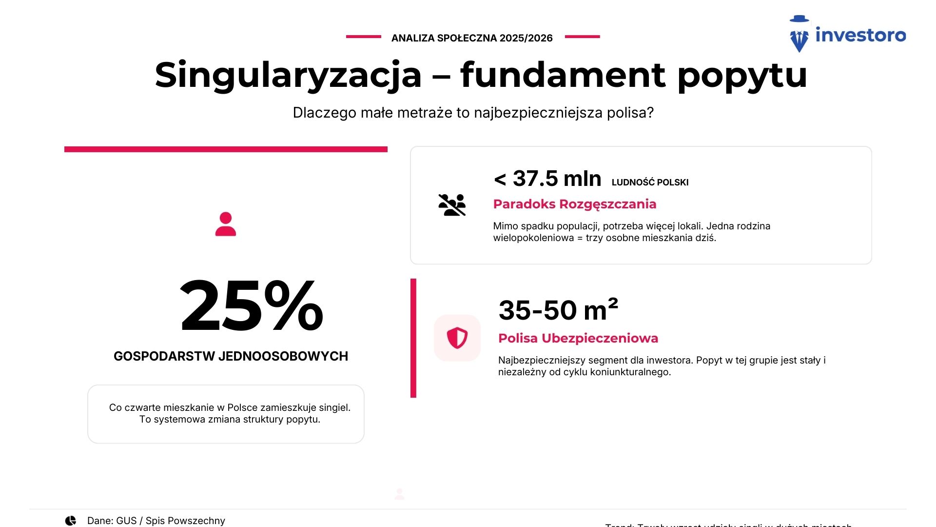 Mimo spadku ogólnej liczby ludności (poniżej 37,5 mln), głód mieszkań nie maleje. Dlaczego? Odpowiedzią jest singularyzacja. Już co czwarte gospodarstwo w Polsce prowadzone jest w pojedynkę, a trend ten przyspiesza w dużych miastach. To zjawisko „rozgęszczania” zasobów mieszkaniowych sprawia, że popyt na mieszkania (lokale dwupokojowe) jest systemowy, a nie koniunkturalny. Tam, gdzie kiedyś w jednym mieszkaniu żyła rodzina wielopokoleniowa, dziś potrzebujemy trzech osobnych lokali dla singli. Dla flippera oznacza to, że segment 35-50 m² jest najbezpieczniejszą polisą ubezpieczeniową – na ten metraż chętny znajdzie się zawsze, niezależnie od cyklu gospodarczego.